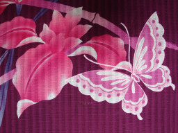 この浴衣は、紫地に、ピンクの百合と、蝶の模様です。華やかな柄が、エレガントな雰囲気を引き立てます!