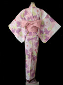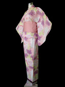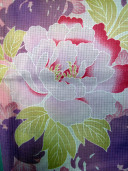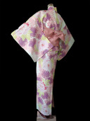 A delightfully detailed yukata with a light pink base.color, decorated with a luscious green, purple and pink peony flower pattern. This modern pattern creates a gorgeous attractive impression.