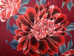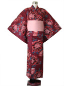 This daring crimson red yukata has a large gorgeous floral pattern surrounded by delicately placed dark green petals. Giving an bold and voluptuous appearance.