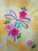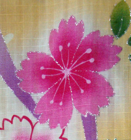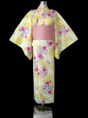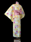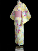 この浴衣は黄色のぼかし染めの中にピンクの桜に紫のリボンの模様。アクセントに青い桜と、白い菊が散りばめられています。さわやかさと女性らしさが、ミックスされた印象に!