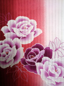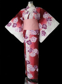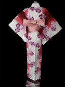 This vibrant yukata has a base white and red color with a beautiful purple and white rose pattern. Perfect for a modern stylish impression.
