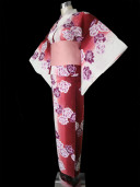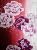 この浴衣は,紅色と白地に、紫と白のバラの模様です。モダンでおしゃれな印象に仕上がります!