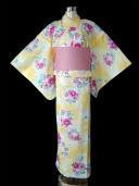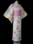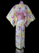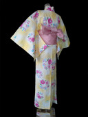 This bright refreshingly yellow yukata has is decorated with white red cherry blossom flower designs. Such fresh color creates a light and distinctive appearance.