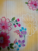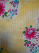 この浴衣は、黄色地に、白い花と、桜の花が手まり の中に綺麗に咲いている模様です。 鮮やかな黄色に、綺麗なピンクの桜の花がアクセントになって 華やかな印象に!