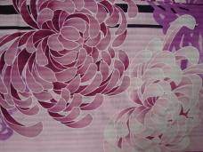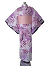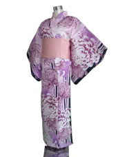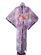This lavish light purple kimono yukata has a modern black stripes which sets it apart from a more traditional style. With several large gorgeous flower patterns creates a modern distinctive appearence.