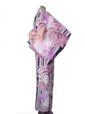 淡い紫地に、艶やかな花と黒のストライプの模様です。ストライプのアクセントで、モダンでゴージャスな印象に!