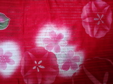 赤地にピンクと赤の朝顔の花の模様です。艶やかな赤が、キュートな朝顔の柄をより引き立ててくれます。パーティにおすすめです。