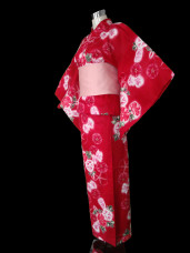 This cherry red kimono yukata is beautifuly decorated with cute pink and red asagao flowers, that are surrounded by deep emerald green leaves. The bright glittery flower buds are contrasted against the bold cherry red to give a cute and playful impression.