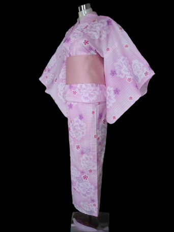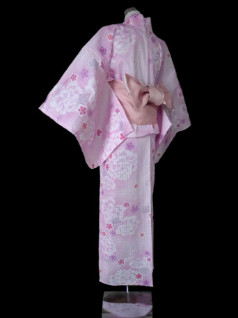 This beautiful pastel pink kimono yukata has subtle white peony flower patterns that are accentuated by cute small red and purple plum flowers. Such a lovely light pink yukata creates a fresh and cute appearance.