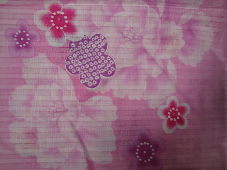 淡いピンク地に、白い牡丹と、赤と紫の梅の模様です。 かわいらしいピンクと、さわやかな牡丹の花の模様が、フレッシュさとかわいらしさを引き立てて くれます。