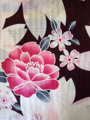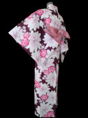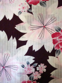 This detailed Kimono Yukata has an earthy red brown base color but is filled with many huge white flowers you can hardly see the background. The small detailed red flowers complete the design to make for a beautifully clean appearance.