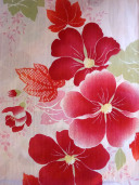 淡いピンク地に、赤い花の模様です。ゴージャスな赤い花のまわりに、バラと紅葉の模様が散りばめられていて、ロマンテックな印象に!
