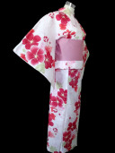 This stunning Kimono Yukata has a gorgeous pastel pink base color that is beautifully contrasted against the large dark red flower patterns. A luscious Yukata for a feminine and slightly bold appearance.