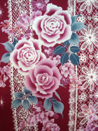 Beautifully crafted black Kimono Yukata has gorgeous detailed white lace pattern set against large vertical stripped background. Finished with beautiful white rose patterns. Perfect for a detailed and complex appearance.