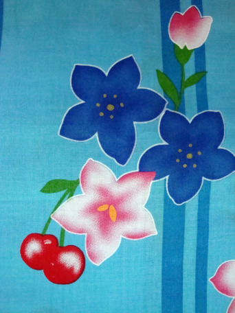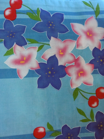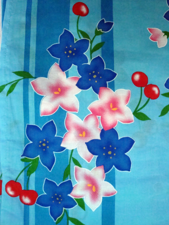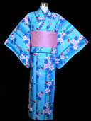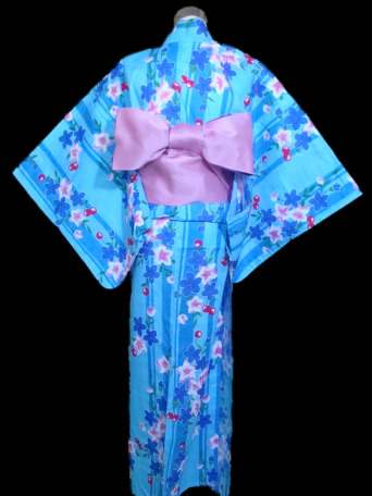 A delightfully bright and genki yellow kimono yukata has perfectly placed blue and pink sakura flower patterns offset the dark yellow stripes. Perfect for that bright, happy and always cheerful person.