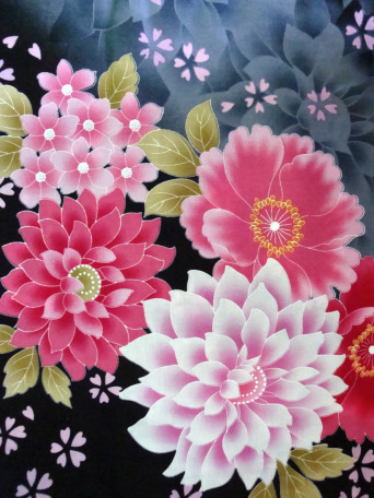 This stylish black and dark blue kimono yukata has beautifully large and detailed, pink and white flower pattern contrasted with the small and delicate pinnk sakura flowers. An elegant yukata for any occasion.