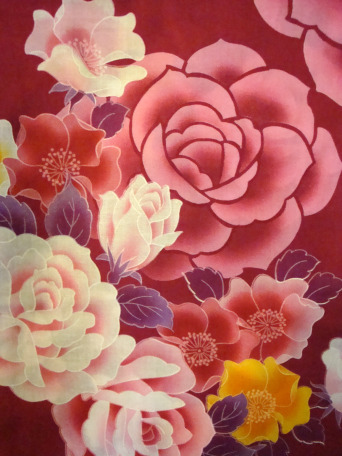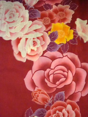 Bright maroon red yukata yukata has beautifuly crafted large white and pink rose patterns, contrasted with small and delicate white plum flower patterns. Beautiful yukata in a slightly daring and bold red.