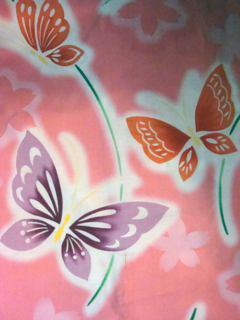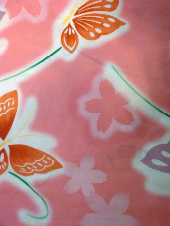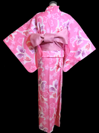 This extra cute bright pink kimono yukata has beautifully designed purple and red butterflies that float between the delicate pink sakura flowers. A wonderful yukata for a cute appearance.