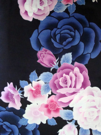 Beautiful dark earthy red floral kimono yukata deccorated with large white and purple blue rose flowers contrasted with the small pink sakura flower designs. Vibrant yukata perfect for all occasions.