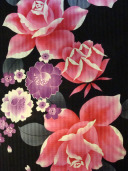 黒地に大胆な赤いバラと、そのまわりに散りばめられた紫と白い花がアクセントになっていて、とてもゴージャスな浴衣です。