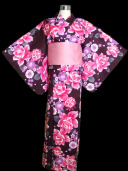 Wonderfully decorated dark maroon red kimono yukata is beautifully decorrated with large pastel pink rose flowers contrasted with small delicate purple sakura flower designs. An excellent yukata for summer festivals.