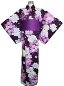 Beautiful flowery dark purple kimono yukata with large gorgeous white lily flower patterns. The pink and purple plum flowers are nestled elegantly creating a wonderful floral design.