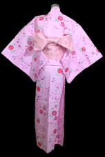 This bright Pink base Kimono yukata has beautiful red cherry blossom flowers and cute bunny rabbit patterns. The touch of green petals perfectly contrasts the cute pink appearance.