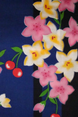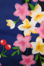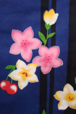 Decorative rich blue Kimono Yukata has dark stripes that fit perfectly with many pink and white cherry blossom flower abundant. Finished with bright red cherries and green petals completes this beautiful floral design.