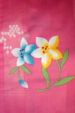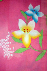 Gorgeous cute pink base color has beautiful large yellow and blue flower patterns with perfectly placed petals. Excellent yukata for a bright genki pink look.