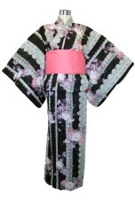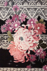 Elegant black kimono yukata has a unique lace design which is beautifully decorated with small pastel purple and pink flowers. Gorgeous yukata with complex design.