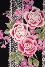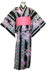 Elegant black kimono yukata has a beautiful lace design with perfectly contrasting pink rose flowers. The light green petals and pink sakura blossoms create a gorgeous yukata for all occasions.