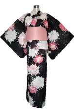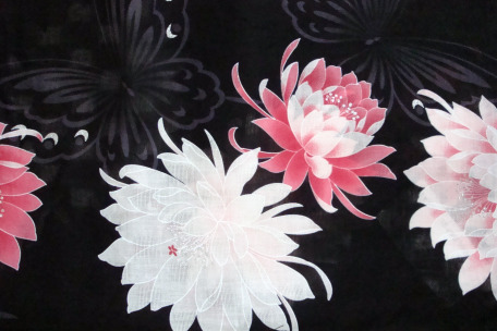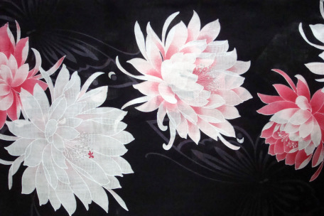Beautiful deep black base color traditional Japanese kimono yukata imported directly from Japan with large pink and white flower patterns. The flowers have gorgeous glitter outline.