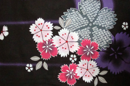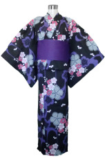 Gorgeous dark traditional Japanese kimono yukata imported directly from Japan, has a dark base color with a purple blue flowers which is beautifully contrasted against small delicate pink cherry blossom flower patterns.
