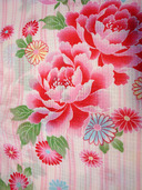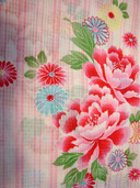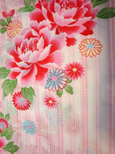 Wonderful pink Japanese Kimono Yukata imported directly from Japan has beautiful thin pink stripes on a white base. The strong pink rose patterns are set perfectly against the green leafs.