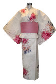 Beautiful light Japanese Kimono Yukata has wonderful white base color contrasted with a strong pink floral design.