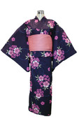 Beautiful Japanese Kimono Yukata has wonderful dark blue base color contrasted with a cute pink floral design.