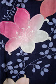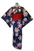 Beautiful Japanese Kimono Yukata has wonderful dark blue base color contrasted with a large pink & white floral design.