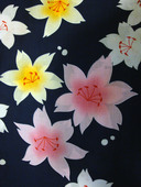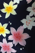 Beautiful Japanese Kimono Yukata has wonderful black base color contrasted with a cute pink, yellow & white floral design.