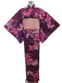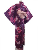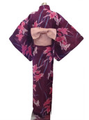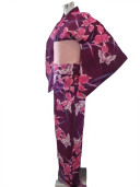 An elegant crimson purple yukata is decorated with beautiful pink lilies and light purple butterflies. Creating a bold but elegant impression.