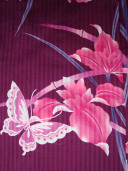 この浴衣は、紫地に、ピンクの百合と、蝶の模様です。華やかな柄が、エレガントな雰囲気を引き立てます!