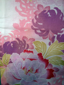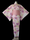 A delightfully detailed yukata with a light pink base.color, decorated with a luscious green, purple and pink peony flower pattern. This modern pattern creates a gorgeous attractive impression.
