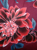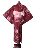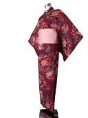 This daring crimson red yukata has a large gorgeous floral pattern surrounded by delicately placed dark green petals. Giving an bold and voluptuous appearance.