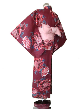 この浴衣は、紅色に大胆な花の模様です。色数を抑えて、クールさとゴージャスさがミックスされた印象に!