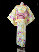 A beautiful golden yellow yukata decorated with pink cherry blossom flowers encompassed by cute delicate leaves and a purple ribbon. Creating a bright, refreshing feminine appearance.