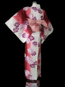 This vibrant yukata has a base white and red color with a beautiful purple and white rose pattern. Perfect for a modern stylish impression.
