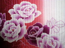 この浴衣は,紅色と白地に、紫と白のバラの模様です。モダンでおしゃれな印象に仕上がります!