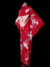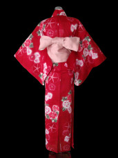 This cherry red kimono yukata is beautifuly decorated with cute pink and red asagao flowers, that are surrounded by deep emerald green leaves. The bright glittery flower buds are contrasted against the bold cherry red to give a cute and playful impression.