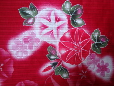 赤地にピンクと赤の朝顔の花の模様です。艶やかな赤が、キュートな朝顔の柄をより引き立ててくれます。パーティにおすすめです。