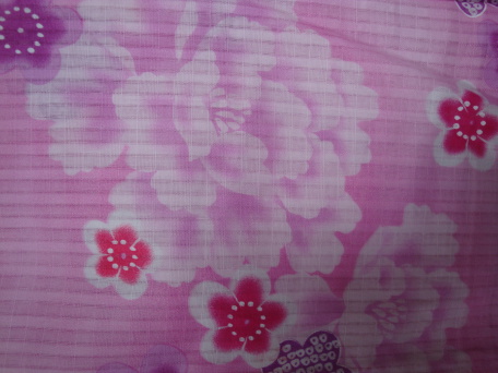 淡いピンク地に、白い牡丹と、赤と紫の梅の模様です。 かわいらしいピンクと、さわやかな牡丹の花の模様が、フレッシュさとかわいらしさを引き立てて くれます。