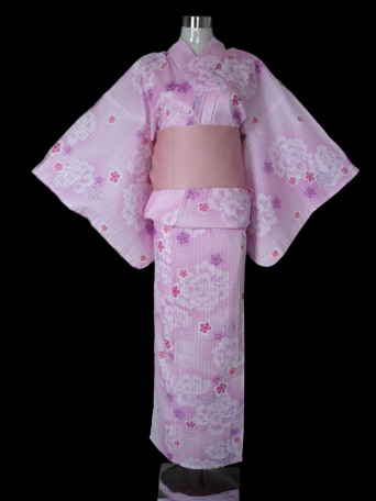 This beautiful pastel pink kimono yukata has subtle white peony flower patterns that are accentuated by cute small red and purple plum flowers. Such a lovely light pink yukata creates a fresh and cute appearance.
